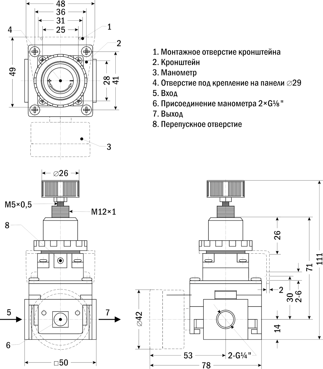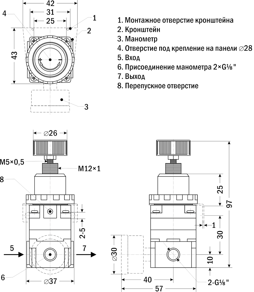 - Все модели регулятора имеют два боковых резьбовых патрубка для присоединения манометра
